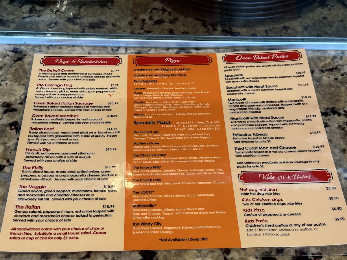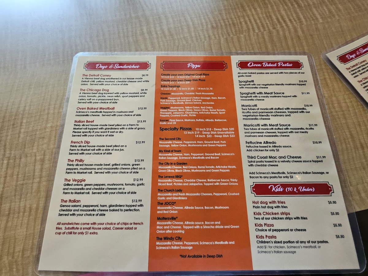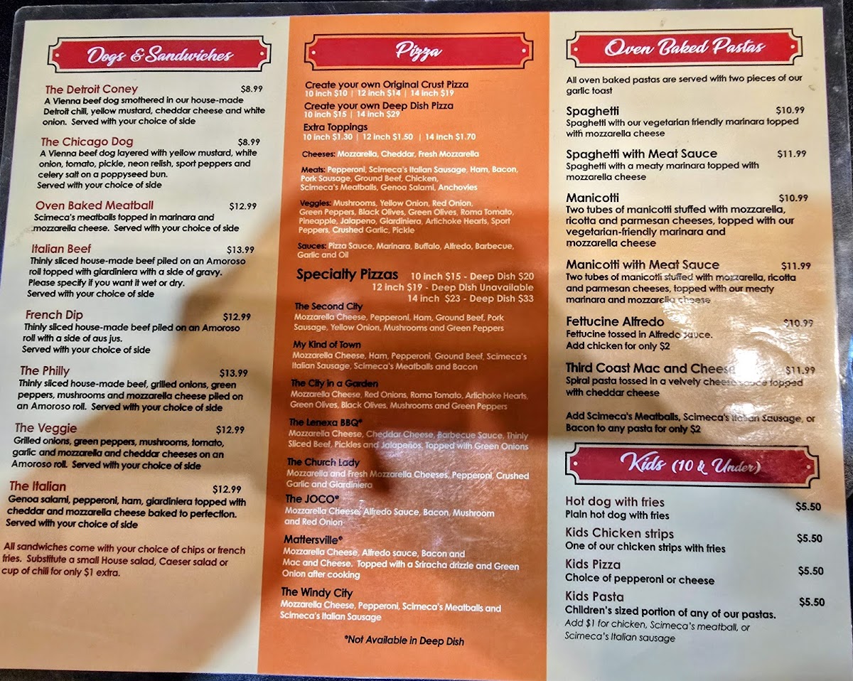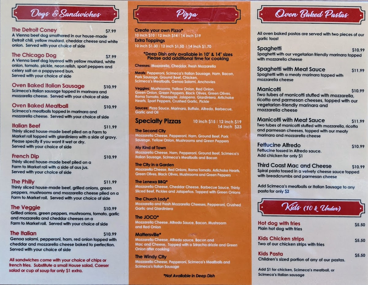 Pepperoni, Scimeca's Italian sausage, and Scimeca's meatballs with mozzarella cheese. Available in 10, 12, or 14" traditional crust or 10 or 14" deep dish.